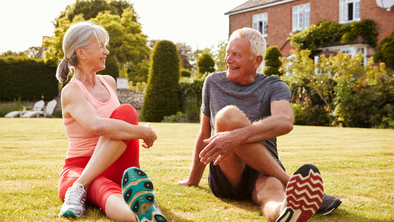 Two senior adults smile while practicing yoga stretches in the grass in front of a house.