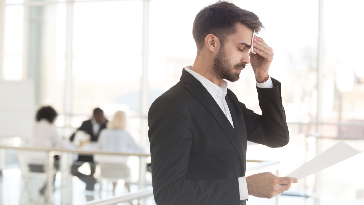 A man in a suit blots his forehead before a presentation due to speaking anxiety.